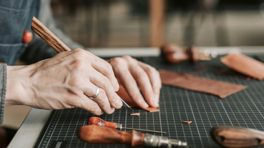 熟練した職人は、革の状態を見極めながら裁断し、手作業で縫製することで、長年の使用に耐える革財布へと仕立て上げます。