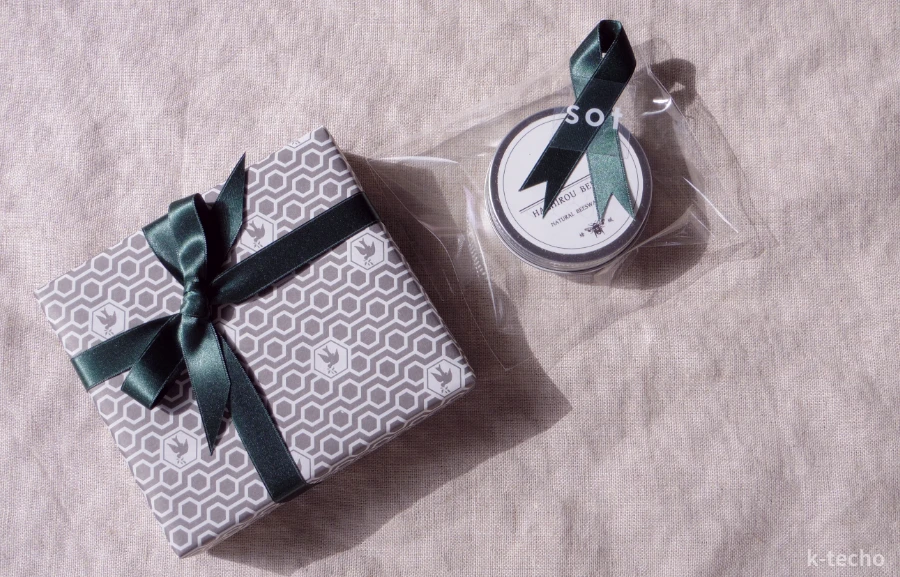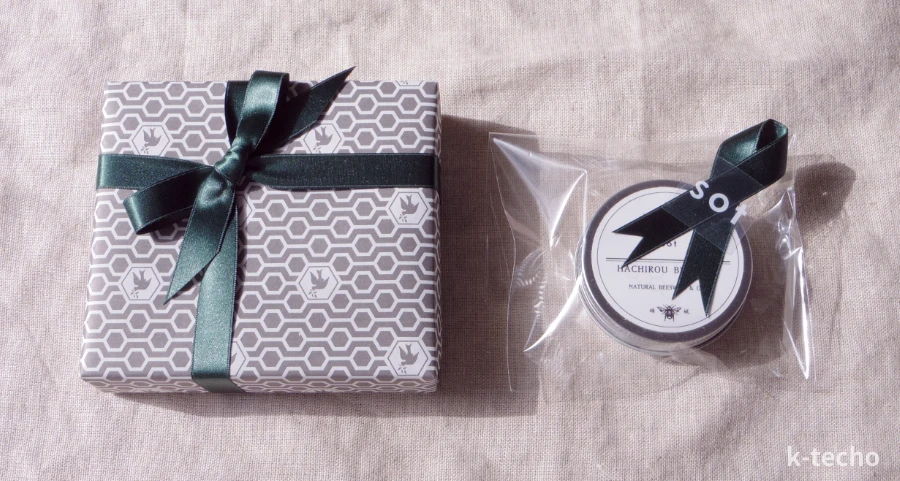 ハチロウ(蜜蝋)も同じように千歳緑色のリボンがあしらわれています。